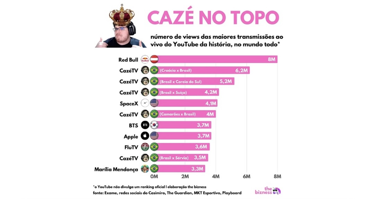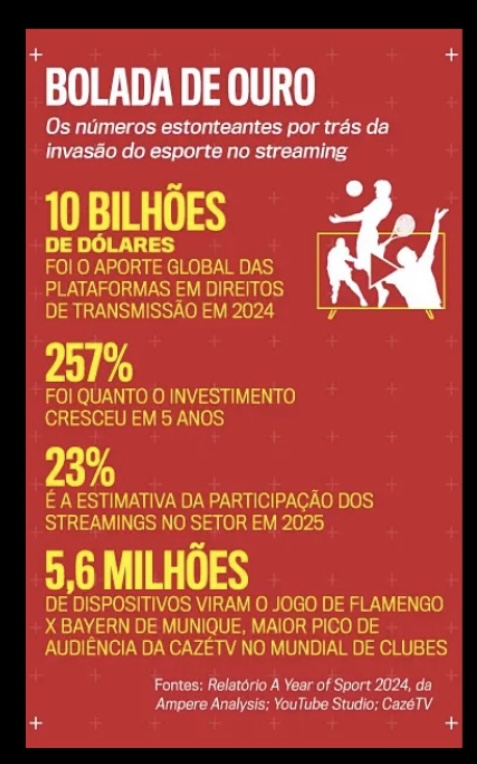 Por décadas, a Globo foi sinônimo de esportes na TV aberta, dominando Copas, Olimpíadas e grandes torneios. Mas a ascensão digital mudou o jogo. Em 2022, nasceu a CazéTV, projeto de Casimiro com a LiveMode, empresa dos ex-donos do Esporte Interativo, que hoje já vale R$1,2 bilhão.