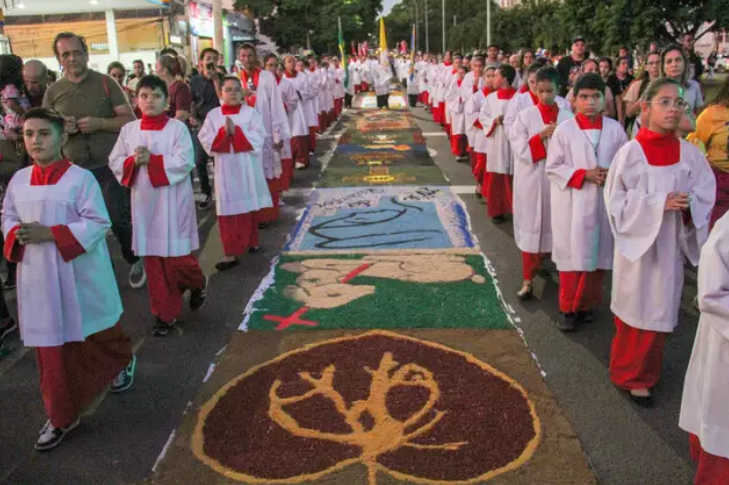 A programação começa logo ao amanhecer. A partir das 6h, mais de 4 mil voluntários de diversas paróquias da cidade se reúnem na região central para confeccionar cerca de 2 quilômetros de tapetes decorados, que enfeitam o trajeto da procissão. Os materiais usados variam entre pó de serra, borra de café, cascas de ovo, sal tingido e tintas — tudo para criar imagens sacras e homenagens à fé. Um dos tapetes mais aguardados é o do Santuário Perpétuo Socorro, que terá 26 metros e utilizará 300 kg de sal colorido, com o brasão do Papa Leão XIV.