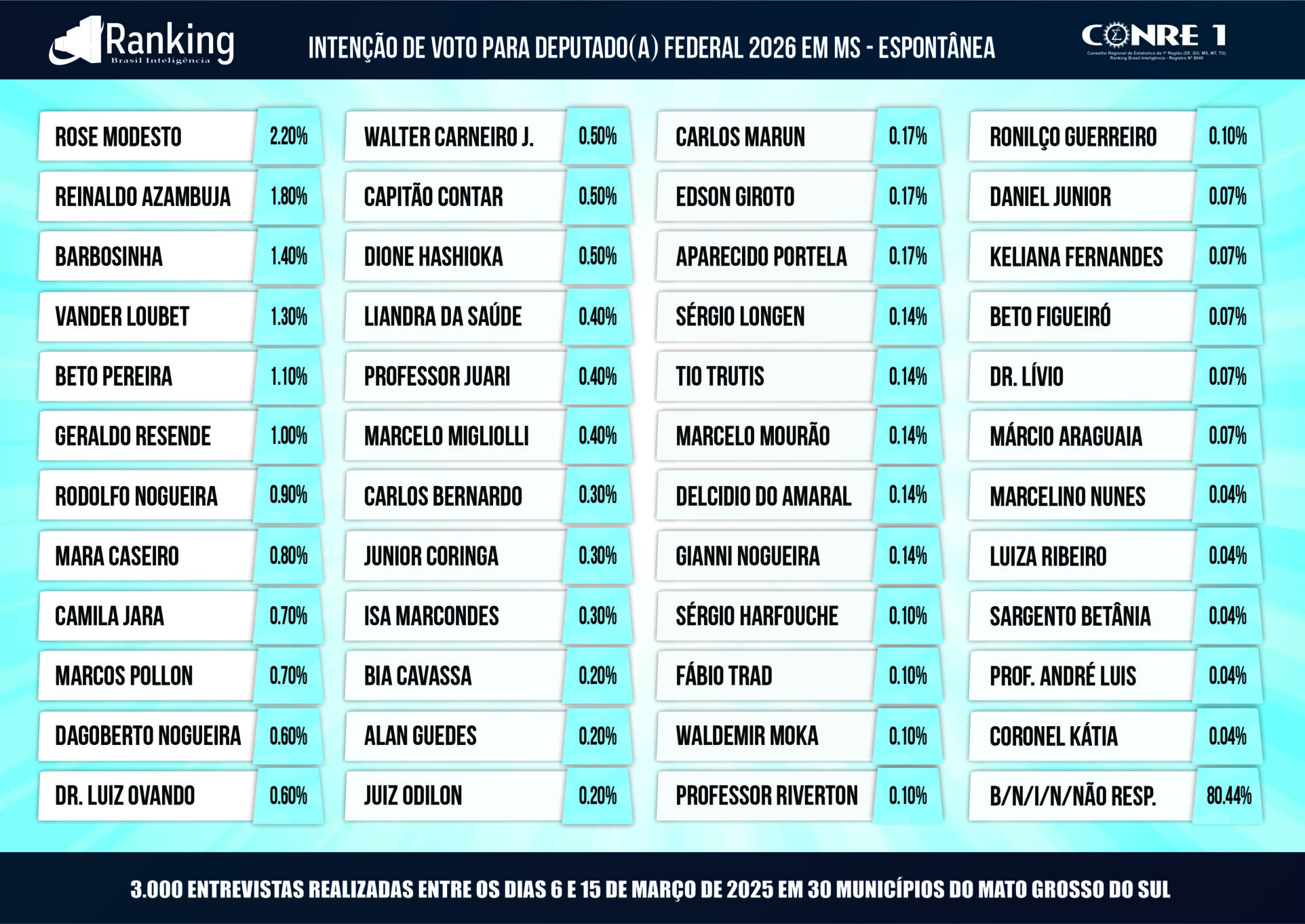O Instituto Ranking Brasil Inteligência divulgou, nesta semana, a primeira pesquisa de intenções de voto para deputado federal em Mato Grosso do Sul nas eleições gerais de 2026. O levantamento, encomendado pela Rede de rádios Top FM, entrevistou 3 mil eleitores, com 16 anos ou mais, em 30 municípios do Estado, entre os dias 6 e 15 de março. A pesquisa tem intervalo de confiança de 95% e margem de erro de 1,8 ponto percentual para mais ou para menos.